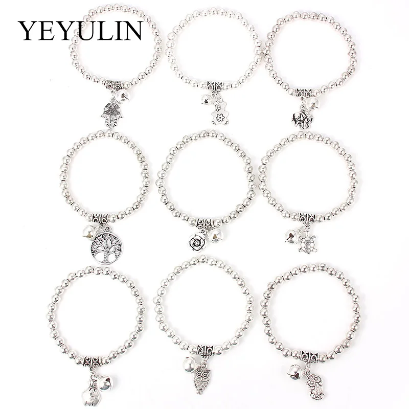 استعارات من الرجعية الفضة لهجة صلصلة الجرس الفيل الدب سلحفاة سحر قلادة سوار مطاطا الإمتداد الخرزة أساور للنساء مجوهرات هدية